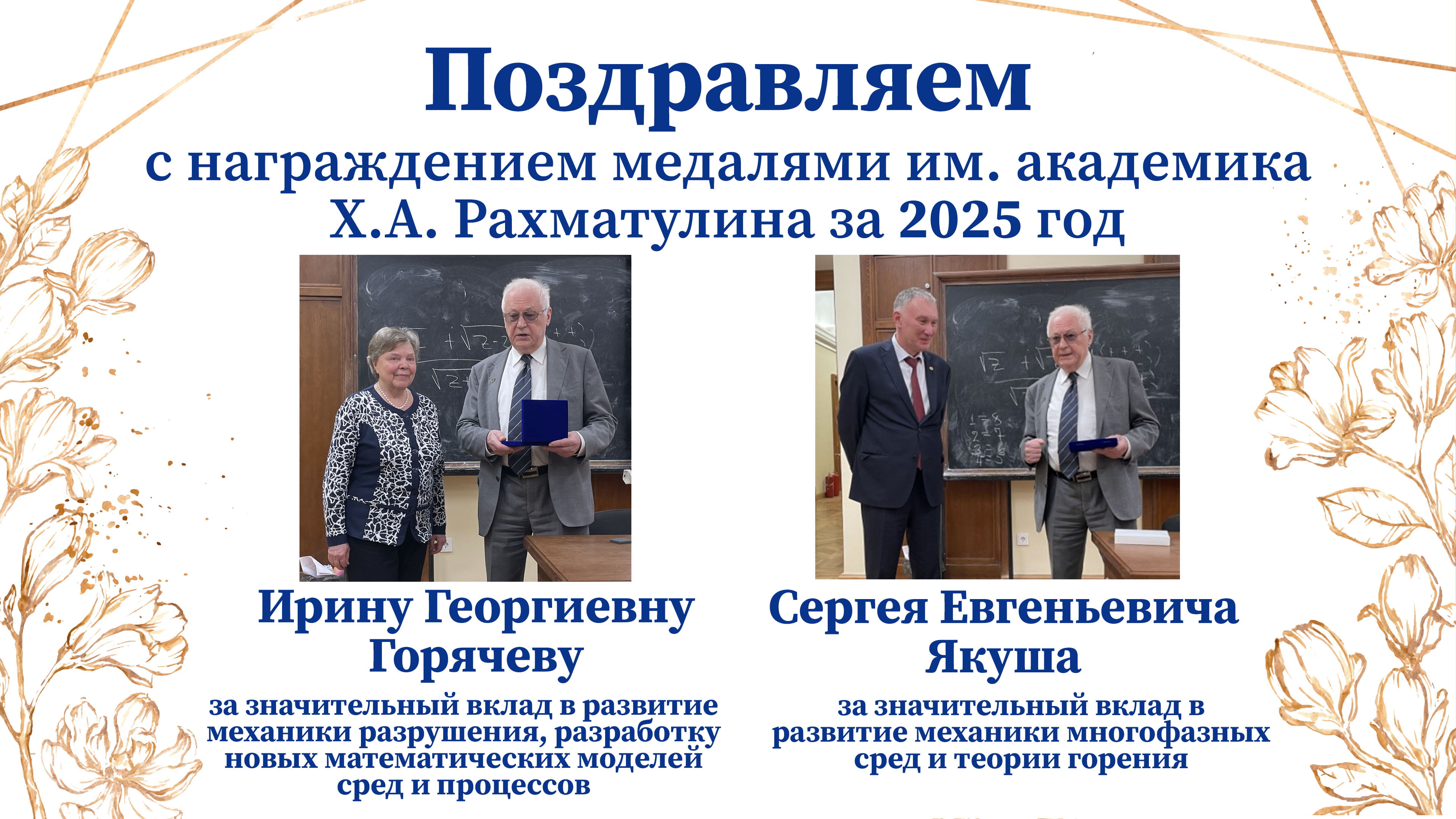 В 2025 году за заслуги в области науки и образования, подготовке высококвалифицированных специалистов коллектив Института проблем механики им. А.Ю. Ишлинского РАН награжден Орденом Почета. В этой высокой государственной награде нашли отражение достижения нескольких поколений ученых, инженеров, конструкторов, творческих и увлеченных людей, работавших в Институте за прошедшие со дня его основания 60 лет! См.: Указ Президента Российской Федерации от 24.06.2025 № 409 >>> Новости. СобытияИзменения на сайте
